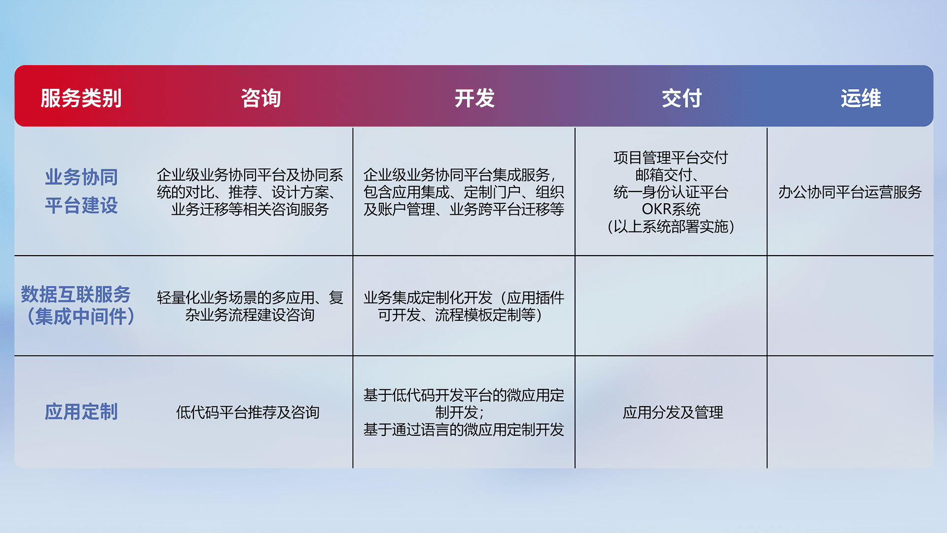 针对钉钉、、、企微、、、、IDaas等平台级产品提供产品的规划、、、方案、、、、交付、、定制化开发等服务,,,,实现如统一协同办公、、、智能客户服务、、混合会议管理、、智能数据查询、、等业务场景,,实现数字化转型。。。。