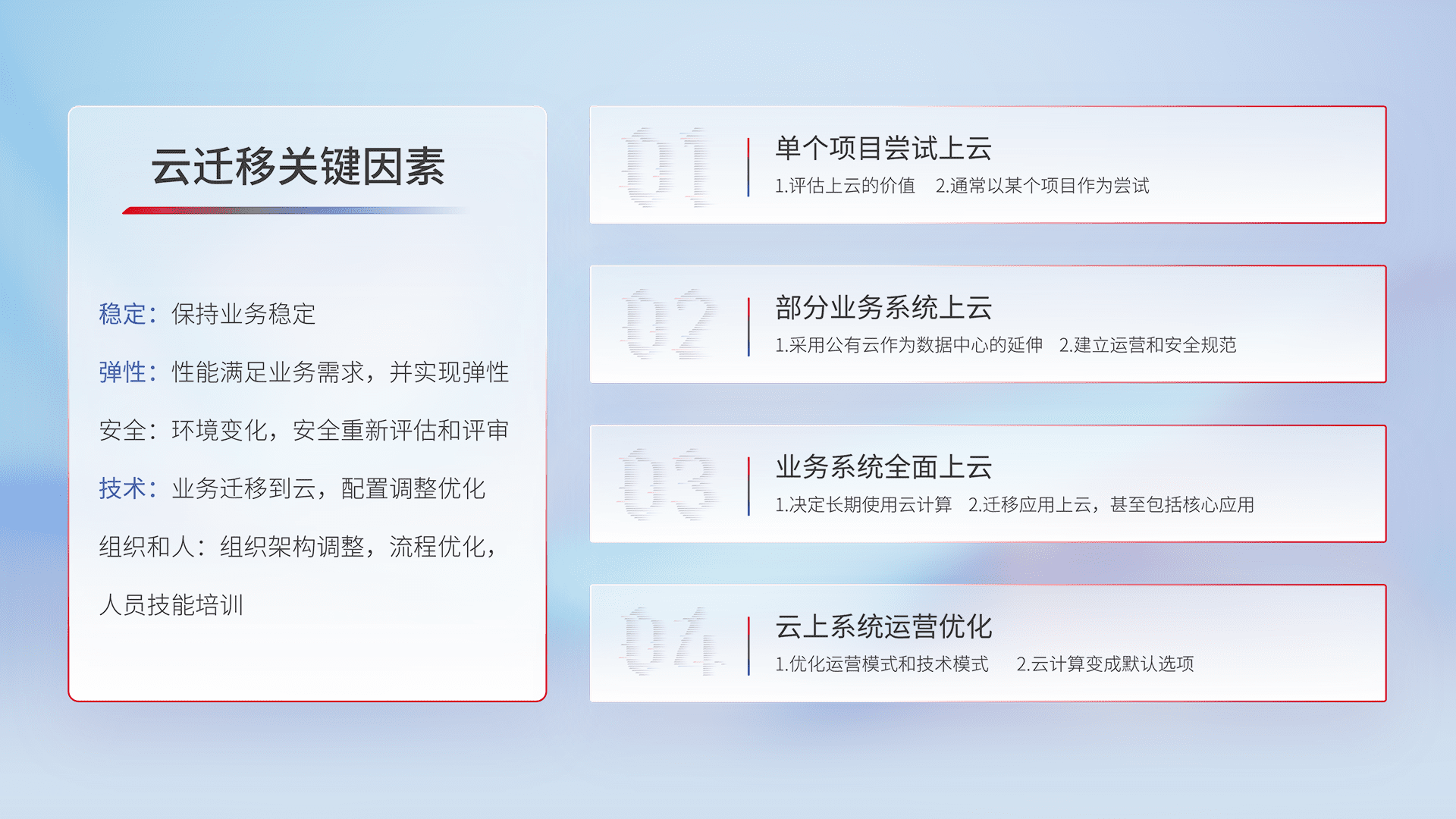 结合实际业务,,,,从规划设计、、、云平台选型、、、云原生改造、、、、数据迁移、、集成交付,,迁移全过程为客户识别最佳上云路径,,做好风险识别管理,,设计网络架构、、身份权限、、、安全审计合规、、、操作审计、、日志审计、、监控告警策略、、多站点容灾设计等,,,对云上基础设施进行整体规划,,,,提升IT治理水平,,,,以满足弹性、、、、高可用、、高性能的需求。。。