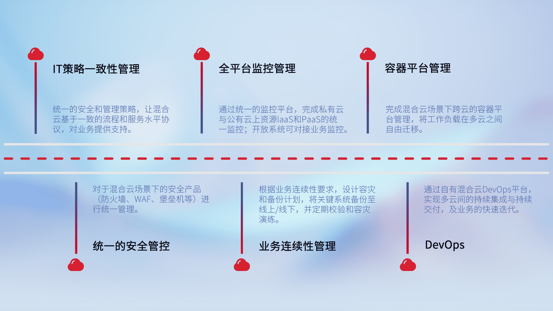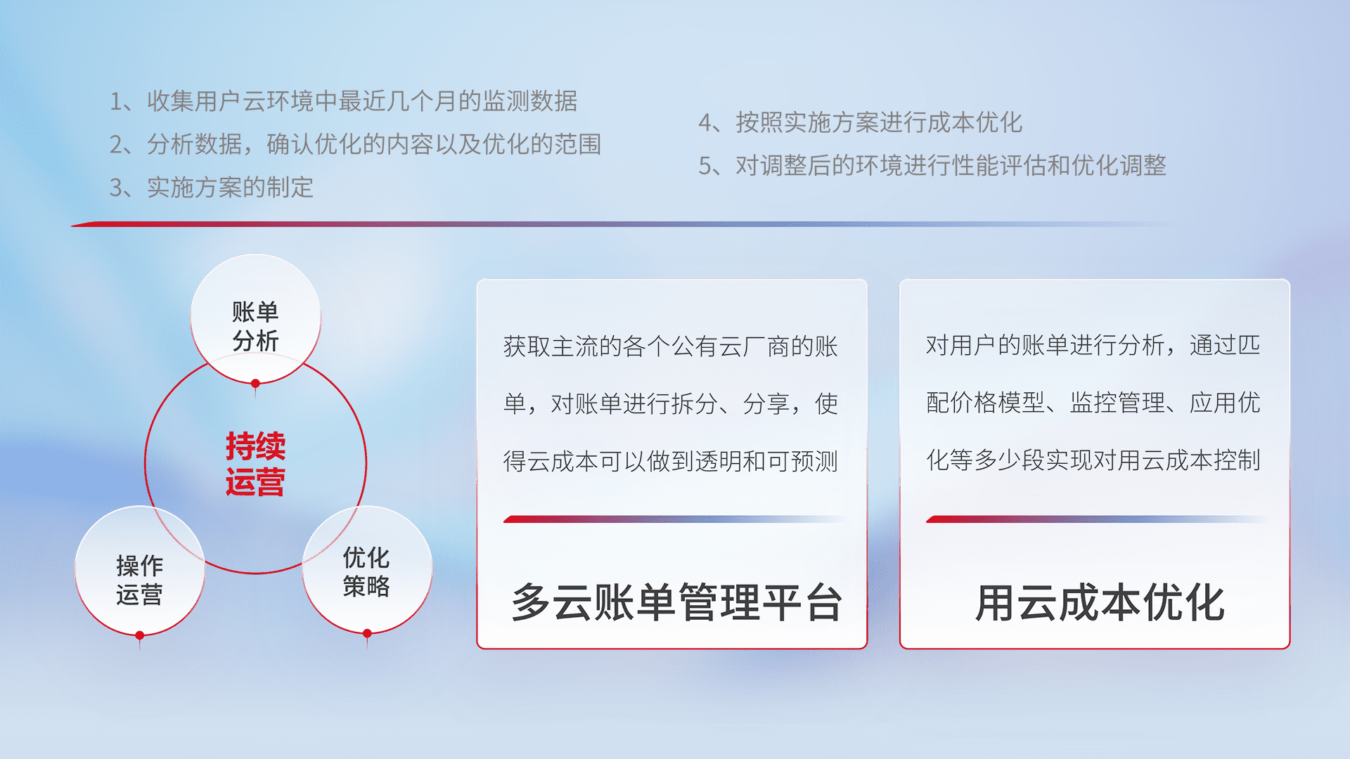 通过多云纳管,,,,以统一的资源数据模型把客户的云资源进行抽象和封装,,进而实现对多云资源的统一操作,,,保障云资源管理的可靠性、、、、稳定性与可用性。。。。量身定制化运维内容,,,,配置、、、开发运维、、、、补丁管理、、、、备份、、监控、、认证和访问管理、、、、审计和日常巡检等,,,保障在用云过程中的可靠度,,稳定度以及高可用率。。
