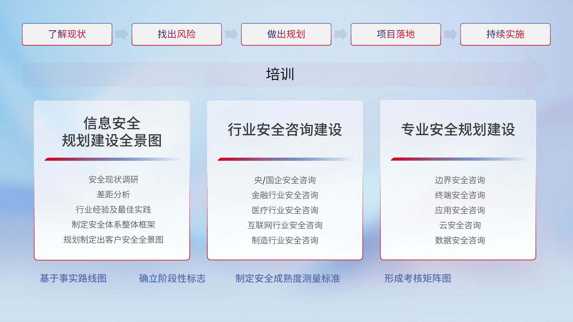 针对客户行业特性,,,以专业的安全服务+多厂商联合解决方案提供专属的一站式安全管理服务,,帮助客户全面感知网络空间威胁,,,,基于识别、、、、检测、、、、分析、、、、防护、、监测、、、响应的服务理论模型,,,从方案咨询、、、、集成交付、、、评估验证、、优化加固、、、、运维运营,,致力于为客户提供完整的闭环管理式安全服务。。以实战经验为客户打造高抵御风险的安全体系,,帮助客户发现威胁、、、对抗威胁、、、、处置威胁,,不断积累安全对抗能力,,持续保障数字化安全。。。